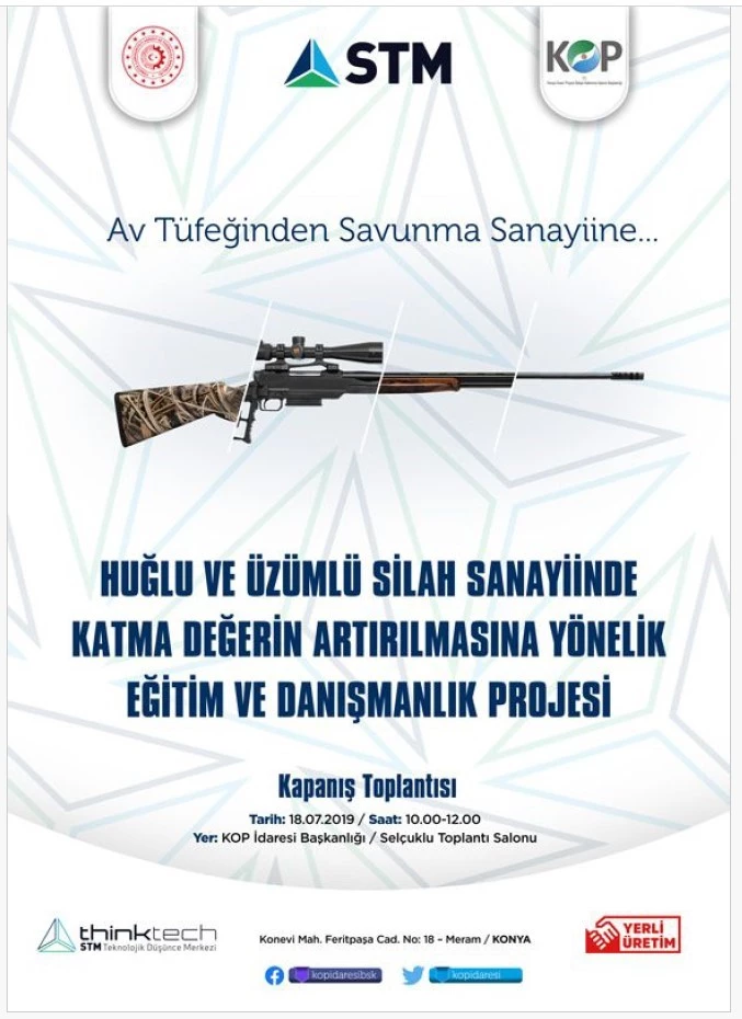 In this context, increasing the added value of shotgun and parts production in the Huğlu and Üzümlü neighborhoods for both domestic and international markets, The project, which aims to increase production efficiency, expand export potential, and integrate the existing shotgun and parts production structure with the defense industry and other related sectors in line with Turkey's 2023 vision, consists of two phases. In this context, the first phase of the project was tendered in October 2017, and the contract for the work was signed with STM Defense Technologies Engineering Inc. in November 2017 for a price of TL 184,080 including VAT and was completed in February 2018. In this phase, a roadmap was created to achieve the above-mentioned objectives in the region. In line with the roadmap prepared within the scope of the project, the implementation of the “Training and Analysis Project for Increasing Added Value in the Huğlu and Üzümlü Arms Industry” was planned for the second phase, and in October 2018, the contract for the second part of the work was signed with STM Defense Technologies Engineering Inc. for a price of 802,400 TL including VAT . The project in question was completed in 2019.