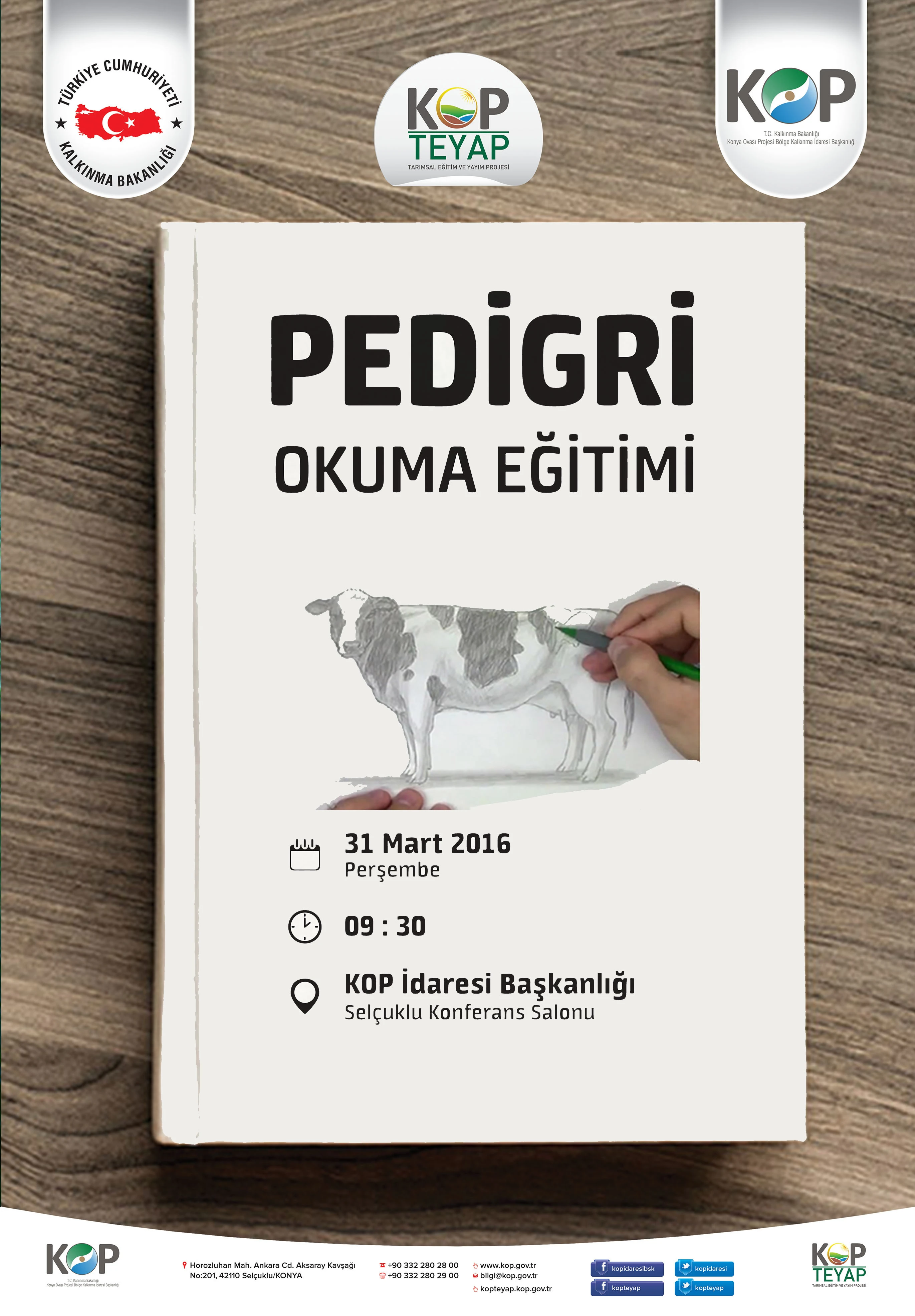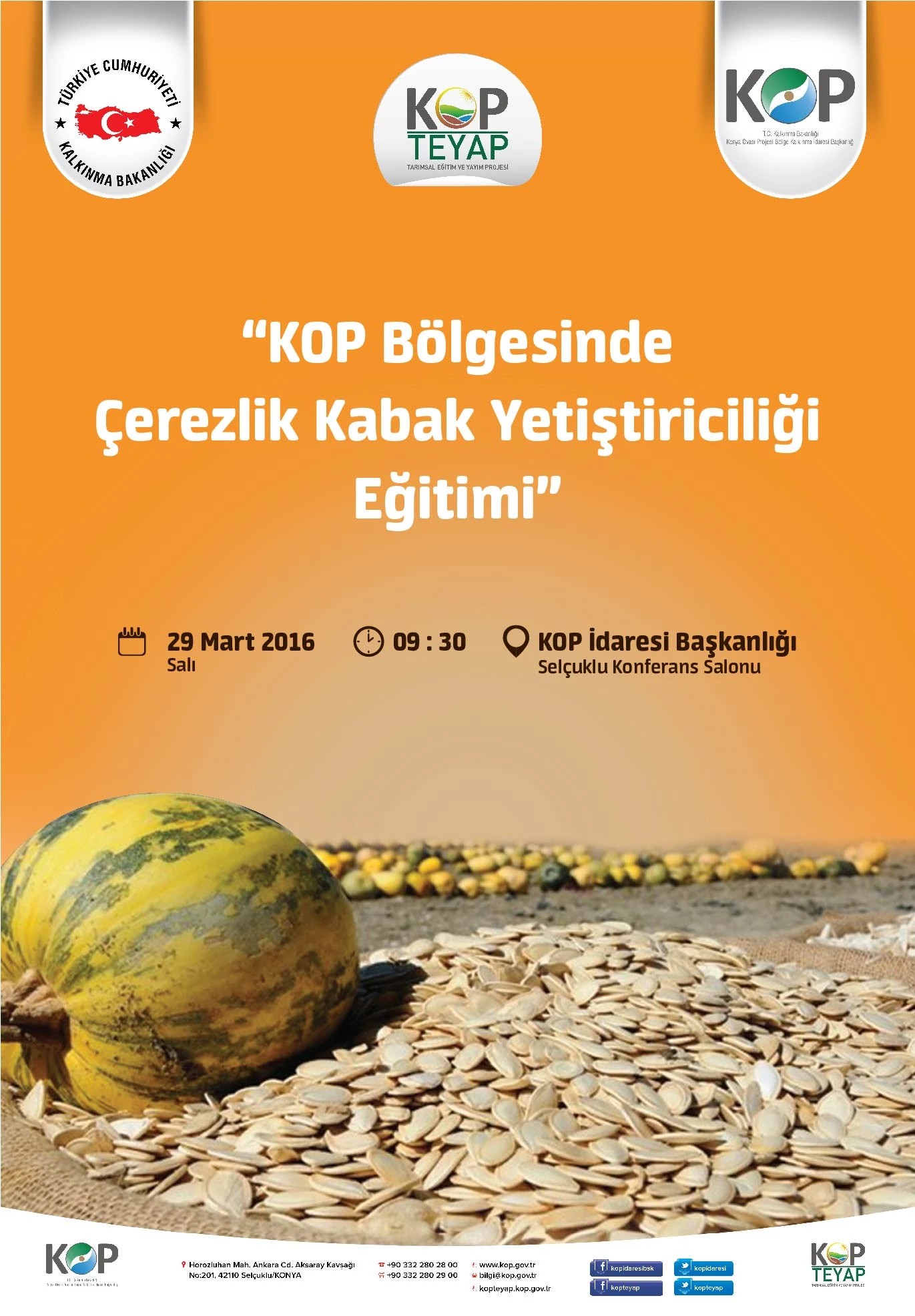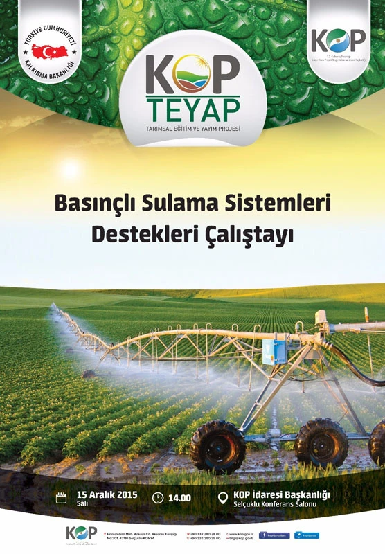 KOP İdaresi'nde bu hafta iki eğitim ve bir çalıştay var. 29 Mart Salı günü "KOP Bölgesinde Çerezlik Kabak Yetiştiriciliği Eğitimi", 30 Mart Çarşamba günü "KOP Bölgesi Sulama Kooperatifleri ve Sorunları Çalıştayı" yapılırken; 31 Mart Perşembe günü ise "Pedigri Okuma Eğitimi" KOP İdaresi Selçuklu Toplantı Salonunda gerçekleştirilecek.