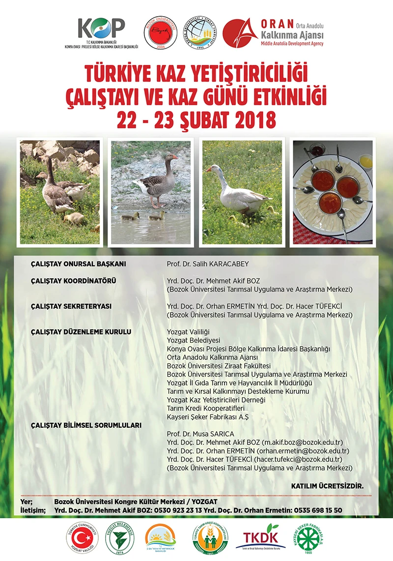Kalkınma Bakanlığına bağlı Konya Ovası Projesi (KOP) Bölge Kalkınma İdaresi Başkanlığı ve Orta Anadolu Kalkınma Ajansı’nın (ORAN) desteği ile Yozgat Bozok Üniversitesi tarafından düzenlenen ‘Türkiye Kaz Yetiştiriciliği Çalıştayı ve Kaz Günü Etkinliği’, üniversitenin Erdoğan Akdağ Kongre ve Kültür Merkezinde yapıldı.