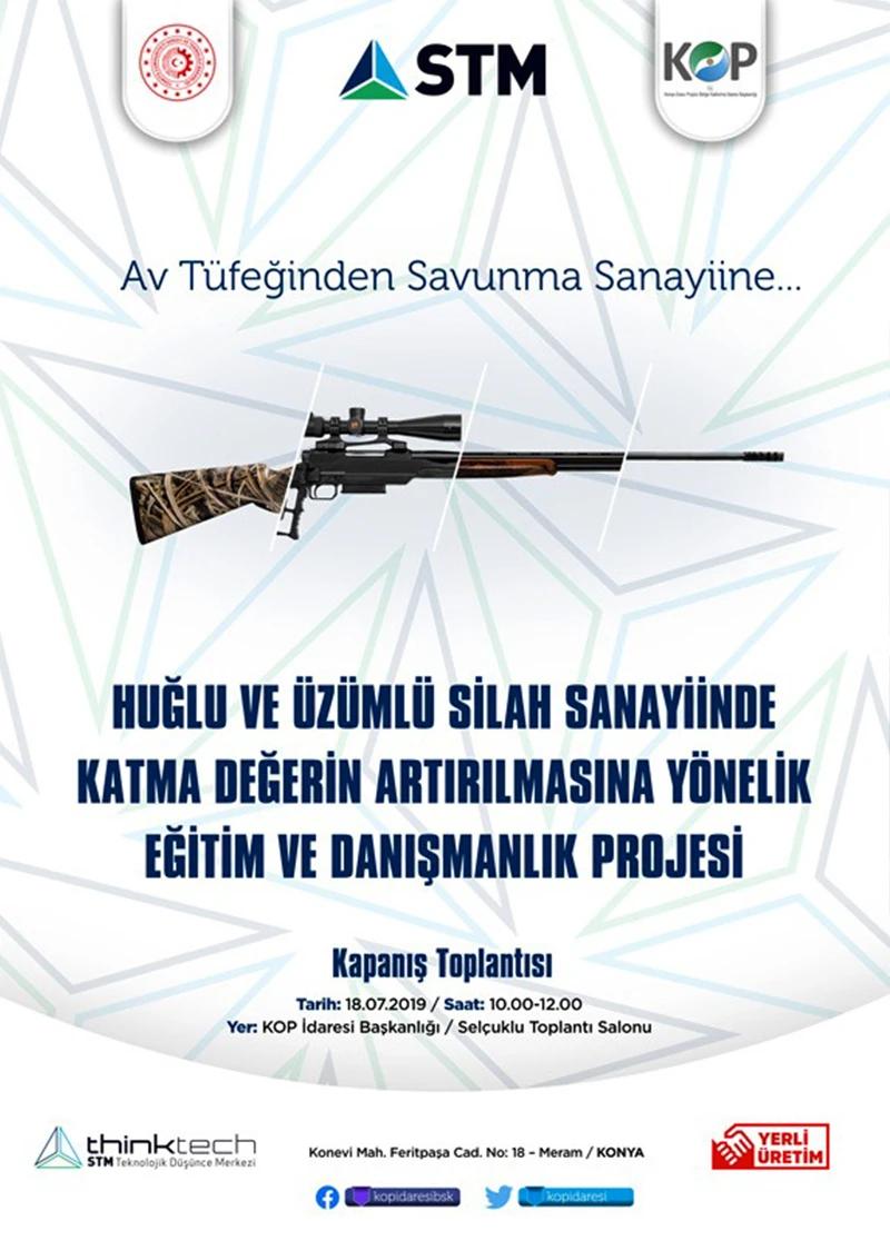 Sanayi ve Teknoloji Bakanlığına bağlı Konya Ovası Projesi (KOP) Bölge Kalkınma İdaresi Başkanlığının, Türkiye’nin yerli ve mili savunma sanayisine yön veren en büyük kuruluşlarından biri olan Savunma Teknolojileri Mühendislik Şirketi (STM A.Ş.) ile birlikte yürüttüğü “Huğlu ve Üzümlü Silah Sanayinde Katma Değerin Artırılmasına Yönelik Eğitim ve Analiz Projesi”nde kapanış toplantısı yapıldı.