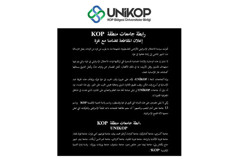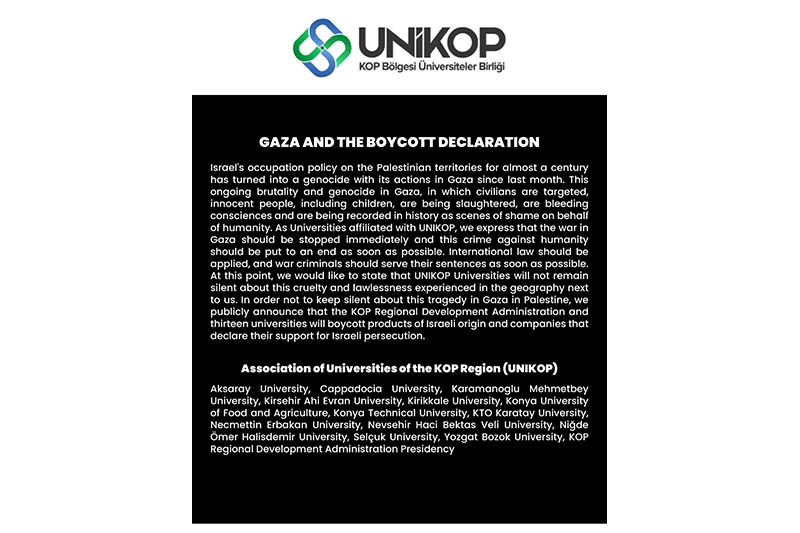 KOP İdaresi Başkanlığı ile KOP Bölgesi Üniversiteler Birliği (UNİKOP) üyelerinin bir araya geldiği 2023 yılı faaliyet ve değerlendirme toplantısından İsrail’in Filistin topraklarında sürdürdüğü işgal politikası için protesto kararı alındı. Türkçe, İngilizce ve Arapça olarak 3 dilde yayımlanan ‘Gazze ve Boykot Bildirisi’nde İsrail’in gerçekleştirdiği soykırımların insanlık adına utanç sahneleri olarak tarihe geçtiğine dikkat çekildi.