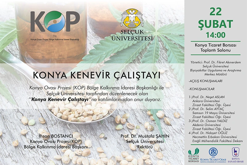 Sanayi ve Teknoloji Bakanlığına bağlı Konya Ovası Projesi (KOP) Bölge Kalkınma İdaresi Başkanlığı ile Selçuk Üniversitesi iş birliğinde düzenlenen ‘Konya Kenevir Çalıştayı’nda, kenevir bitkisi ve kullanım alanları masaya yatırılacak.
